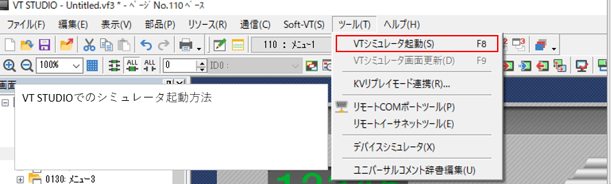シミュレータ機能を使用するためには、「メニューバー」→「ツール」→「VTシミュレータ起動」を選択します。